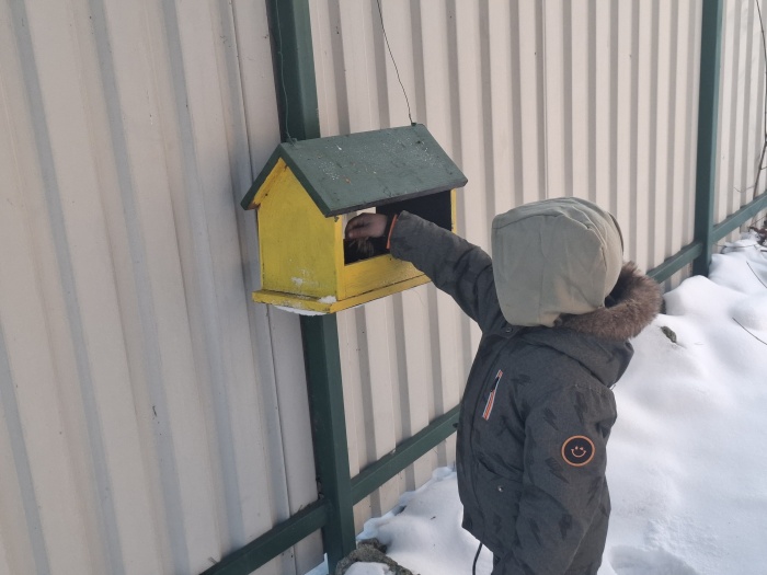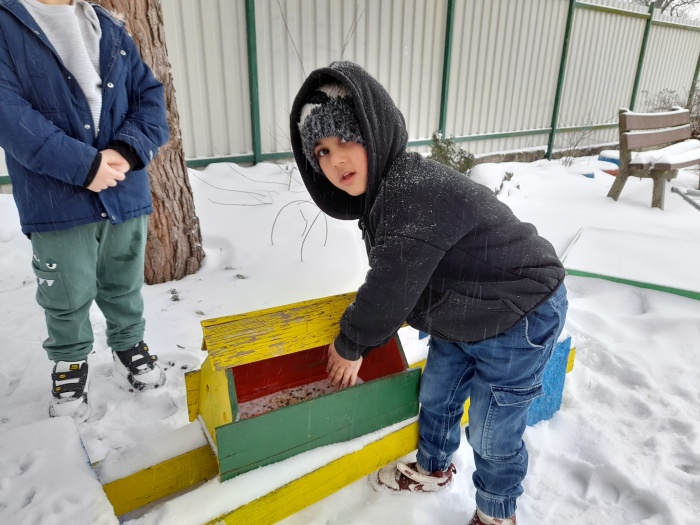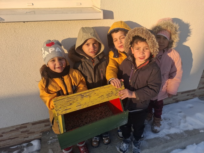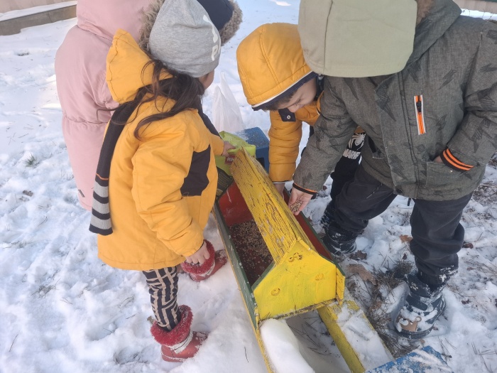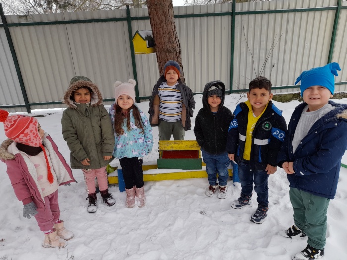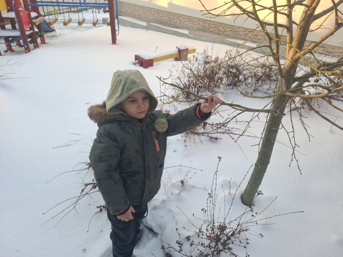 V januári sme mali týždennú tému zameranú na lesné a voľne žijúce zvieratá a starostlivosť o nich v zime. V priebehu celého týždňa sme spoznávali zvieratká, ako zimujú, a ako sa o ne starajú ľudia, keď im sneh skryje potravu. Nezabudli sme ani na vtáčikov, ktoré žijú v našej záhrade a okolí. V záhrade sme osadili dve kŕmidlá, do ktorých sme nasypali semienka a na stromy sme zavesili semienkové guľôčky. No a celý mesiac sme semienka dopĺňali a spoločne pozorovali, ako vtáčiky zobkajú dobrôtky, ktoré sme im dali. Jedno kŕmidlo sme dali aj na parapetu okna v triede, a tak teda máme „vtáčie divadielko“ každý deň.