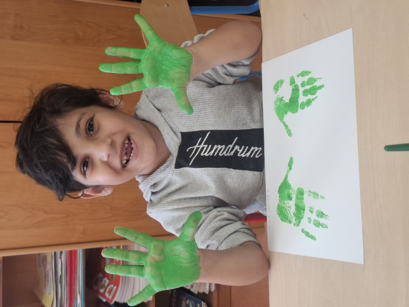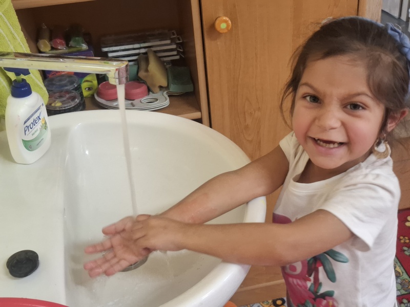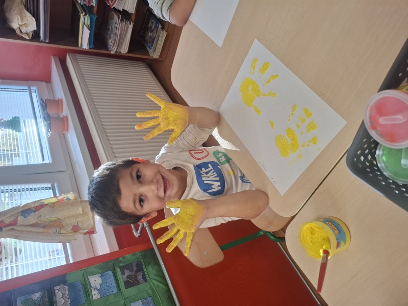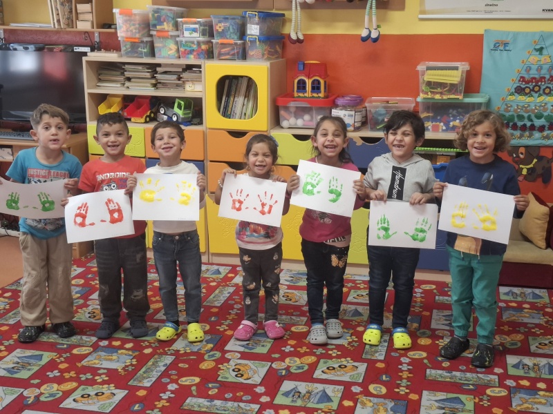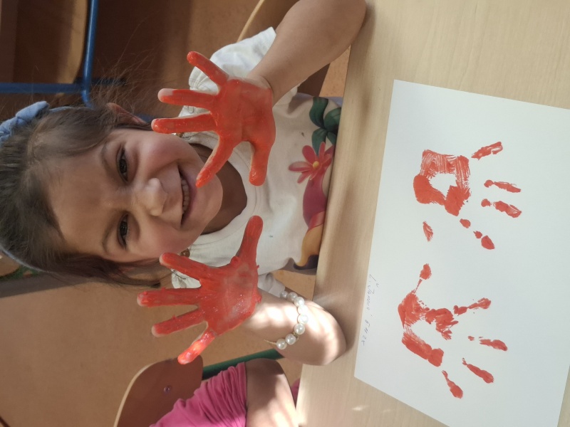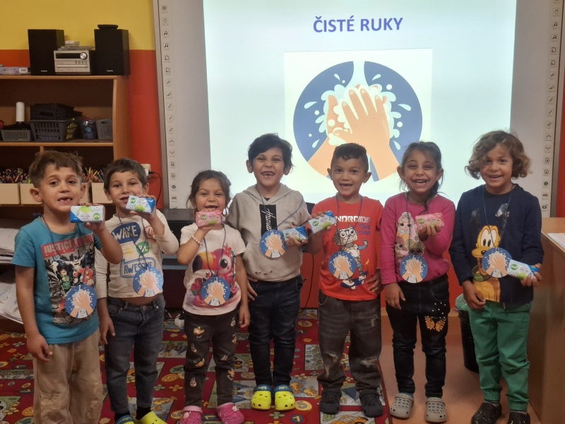 V novembri sme realizovali aj triednu aktivitu - Čisté ruky. O dôležitosti dodržiavania základných hygienických návykov sa samozrejme rozprávame vždy, ale je dobré si niektoré veci aj viac ozrejmiť, priblížiť, zopakovať. Deti si upevňovali dodržiavanie hygienického návyku umývania rúk vzhľadom na prenos infekčných ochorení. Na základe interaktívnej prezentácie sme sa oboznámili so význam a správnou technikou umývania rúk. Zaspievali sme si pesničku Každá rúčka ..., počítali a pomenovali prsty, zahrali sa s prstami rôzne cvičenia a šli sme maľovať. Pred maľovaním sme si prakticky nacvičili správnu techniku umývania rúk. Ale maľovali sme inak a to: pravou rukou sme namaľovali ľavú a urobili otlačok, ľavou rukou zase pravú a otlačok. Prstové farby sú super ... takto to skonštatovali deti. Ruky sme si samozrejme museli vždy umývať. V tento deň boli teda naše ruky enormne čisté. V závere deti zhodnotili dnešné aktivity, boli odmenené medailou a ako darček dostali detské mydielka Bupi.
