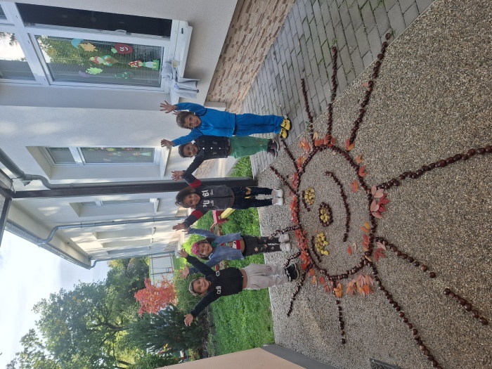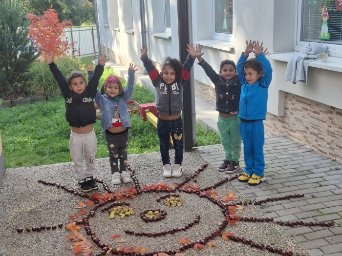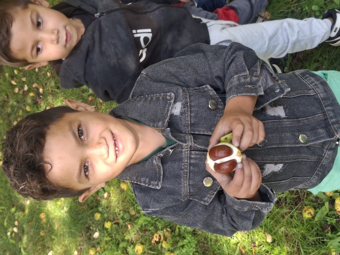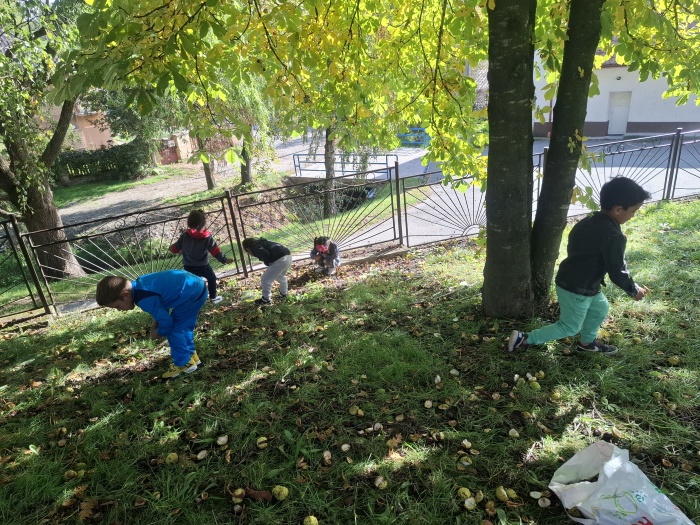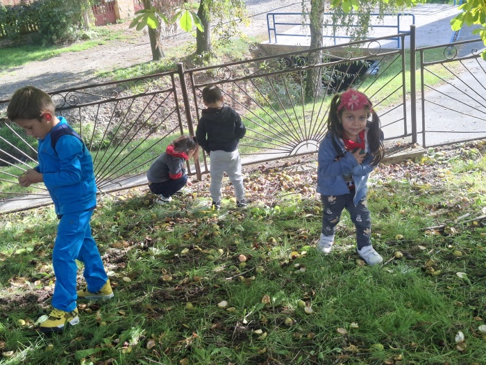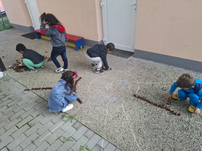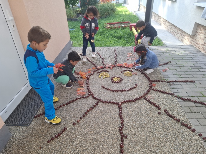 Naše deti neskutočne radi zbierajú gaštany. Museli sme ich ísť zbierať dokonca dvakrát. A keď sme mali toľko veľa nazbieraných gaštanov, čo s nimi? No urobíme si jesenný obraz. Na línie predkresleného slniečka deti ukladali gaštany a vytvorili nádherné slniečko. Možno sa vám to zdá príliš jednoduché, ale nie je to tak. Aj pri takom jednoduchom námete deti plnili mnoho úloh a cieľov – boli sme na vychádzke a vytvárali vonku, to znamená rozvoj rôznych pohybových zručností a pobyt na čerstvom vzduchu. Zbieranie a ukladanie gaštanov – rozvoj jemnej a hrubej motoriky. Spoznávanie gaštana – strom, plody. Okrem toho sme pri tom všetkom stále rozprávali – rozvoj reči, pochopenia inštrukcie, tvorili, .... a tešili sa. Vidíte ozaj toho bolo veľa ....